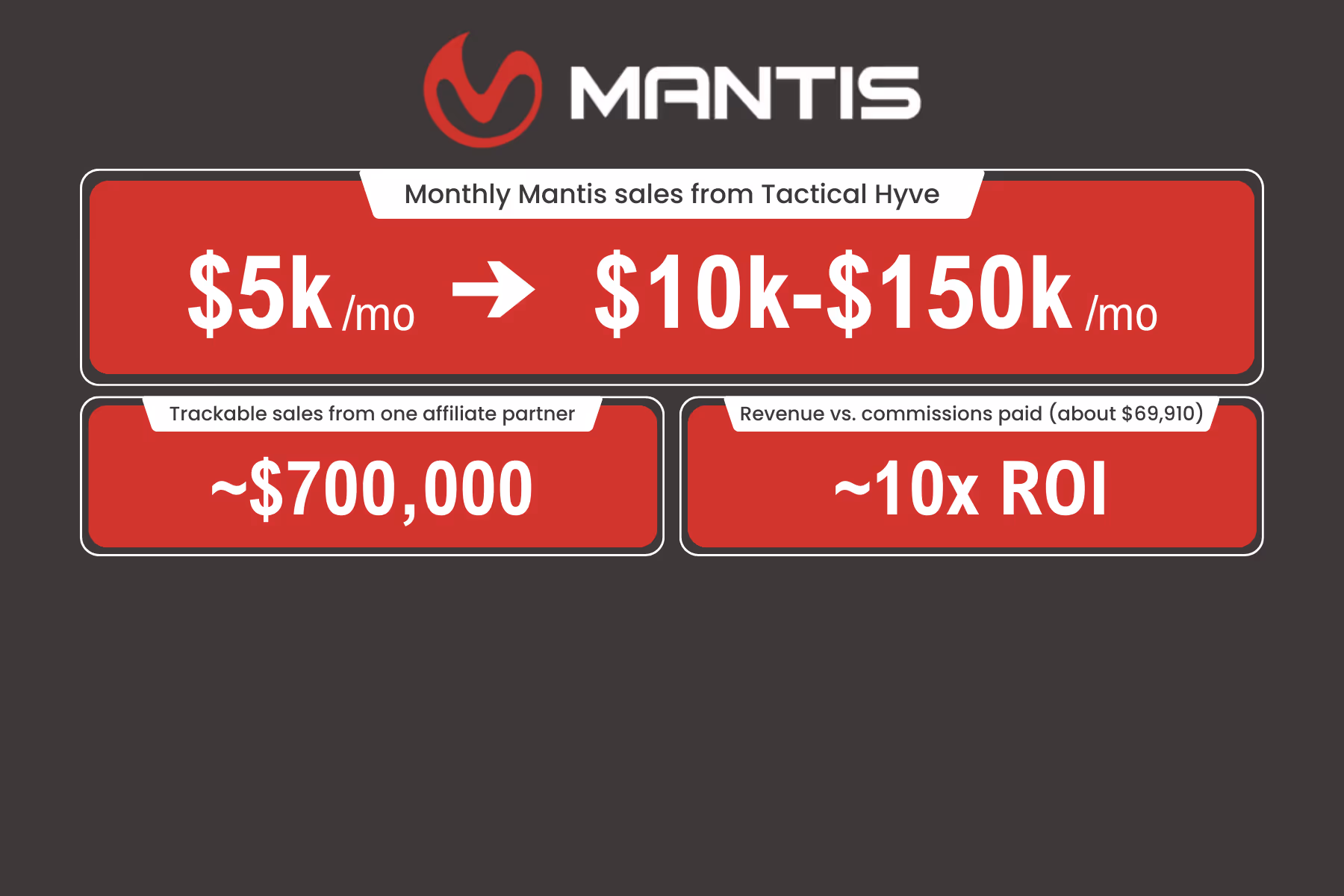 Tactical Hyve content + affiliate strategy drove ~$700k in Mantis sales at ~10x ROI.